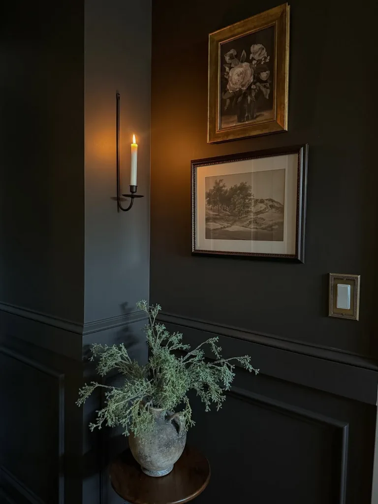 So what color is Silhouette, exactly? It isn’t just “brown.” It’s a deep charcoal‑brown with lots of layers. Benjamin Moore calls it an elegant blend of espresso and charcoal—which was inspired by classic menswear collections. It also appears to have a subtle purple cast, too. In my experience, a complex color like this one means it’ll read differently depending on lighting and what you pair it with—cream and beige make it feel neutral and sophisticated, but blushes, mauves or muted greens pull out its moody, bohemian vibe.